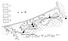 | 図3 土器などの散布状況 | 図4 土器片などの散布地 A1.合せヶ谷,A2.追後北, A3.追後西 B4.長者ヶ庭南,B5.長者ヶ庭 C6.オアシス水尻 |